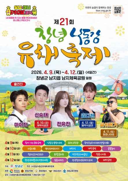 창녕낙동강유채축제창녕군 남지읍 낙동강 유채단지는 전국 단일면적으로 최대 규모인 110ha(33만여 평)로, 낙동강의 수려한 경관과 어우러져 한 폭의 풍경화를 연상케 하는 대표 봄 관광지이다. 창녕낙동강유채축제는 2006년 제1회를 시작으로, 유채꽃의 아름다움을 전국에 알리고 관광객과 지역민이 함께 어우러지는 창녕군 대표축제로 자리매김하였다. 축제 기간에는 개막식 공연을 비롯해 지역 문화공연, 유채꽃라디엔티어링, 전시 및 체험행사 등 다채로운 프로그램이 운영되며, 방문객들에게 풍성한 볼거리와 즐길 거리를 제공한다. 특히 드넓은 유채꽃밭과 낙동강이 어우러진 경관은 봄의 정취를 만끽할 수 있는 힐링 공간으로 많은 관광객의 발길을 이끌고 있다.