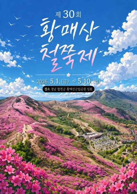 황매산철쭉제황매산철쭉제는 경상남도 합천군 가회면 소재 황매산군립공원에서 개최되는 봄철 대표 지역 축제이다. 2026년에 열리는 제30회 황매산철쭉제는 5월 1일부터 10일까지 10일간 진행된다. 축제가 열리는 황매산군립공원 철쭉군락지는 전국 최대 규모의 철쭉군락지로, 약 30헥타르(ha)의 면적을 자랑한다. 이곳에 자생하는 철쭉은 산철쭉으로, 일반적인 철쭉이나 진달래와 구별되는 대표적인 한반도 자생종이다. 축제 기간 동안 철쭉과 억새 사이 관광휴게소 부근에서는 나눔카트투어, 도슨트투어, 버스킹 공연, 목재게임 등 다양한 체험 프로그램이 운영된다. 또한 문화 공연과 지역 특산물 장터가 함께 열려 방문객들에게 풍성한 즐길 거리를 제공한다. 황매산철쭉제는 자연경관과 문화체험이 어우러진 봄철 관광 명소로 자리매김하고 있다.